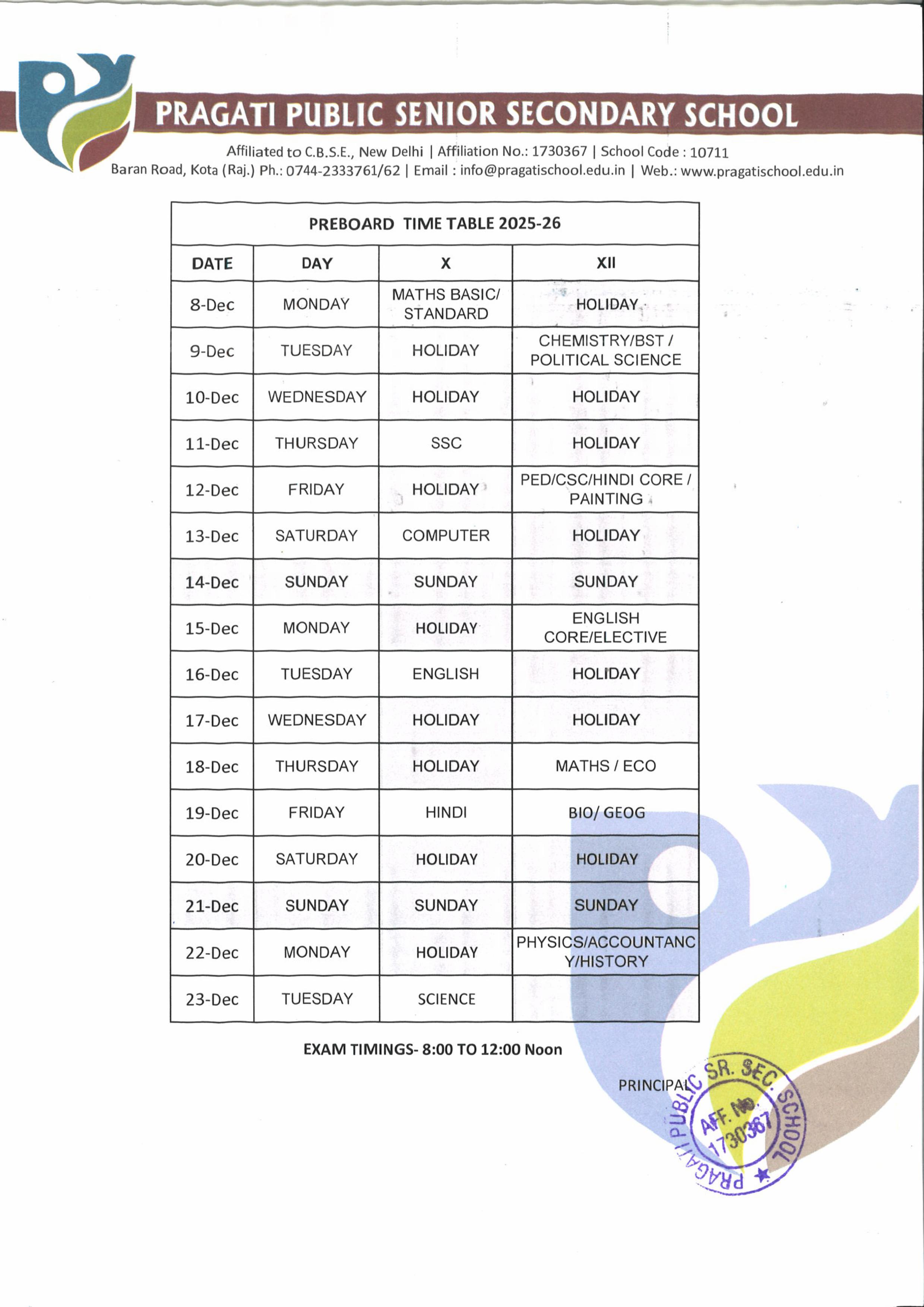 PRE BOARD TIME TABLE X & XII Download