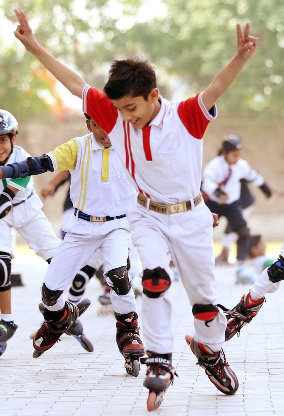 The action or activity of gliding on ice skates or roller skates as a sport or pastime.